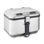 La maleta posterior de moto Trekker Alaska de aluminio acabado negro, 44 L.. Puede albergar un casco modular. Dotada del sistema de fijación MONOKEY®, que permite utilizar la misma llave para la cerradura, la apertura y el desenganche de la parrilla. Compatible con todas las parrillas Monokey, excepto las que están dotadas de contacto para el kit de luz de stop.
